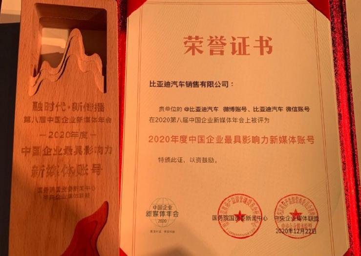 连续五年上榜 比亚迪获评中国企业最具影响力新媒体
